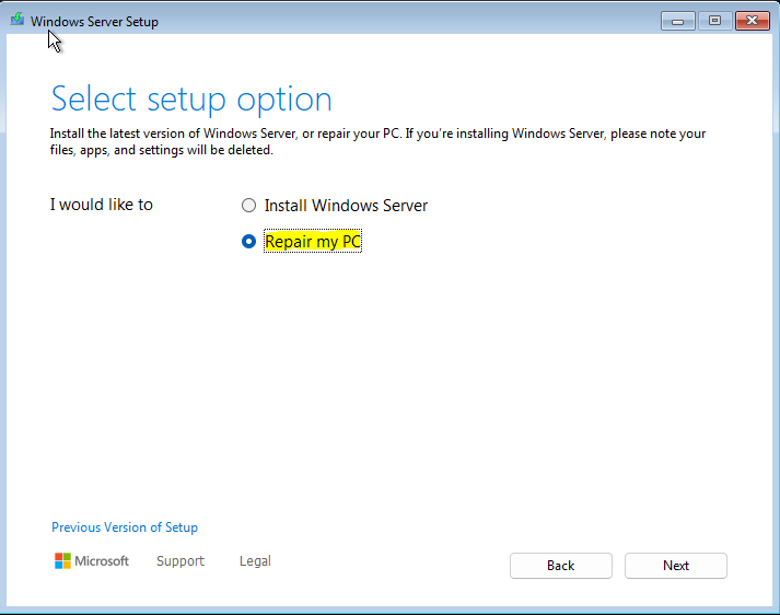 DC’imize Windows Server CD’si takıp restore mode’da başlatalım.