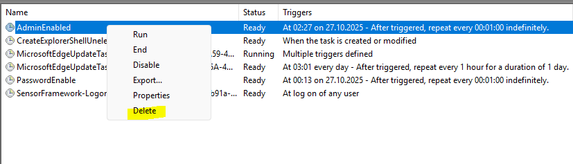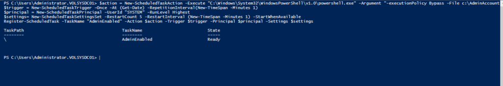Register-ScheduledTask -TaskName "AdminEnabled" -Action $action -Trigger $trigger -Principal $principal -Settings $settings