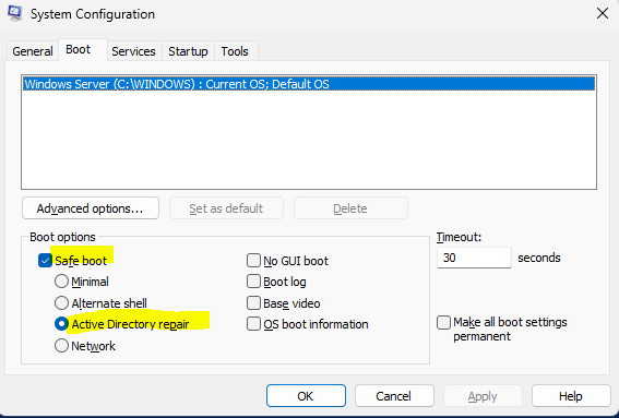 Safe Modda AD Servisleri çalışmaz. Ayrıca Windows’da sağ altta Safe Mode veya MSConfig’dan AD Repair modda olduğunu görebiliriz. AD Servisleri çalışmadığından User and Computers, Group Policy gibi bölümlere giriş yapamayız.